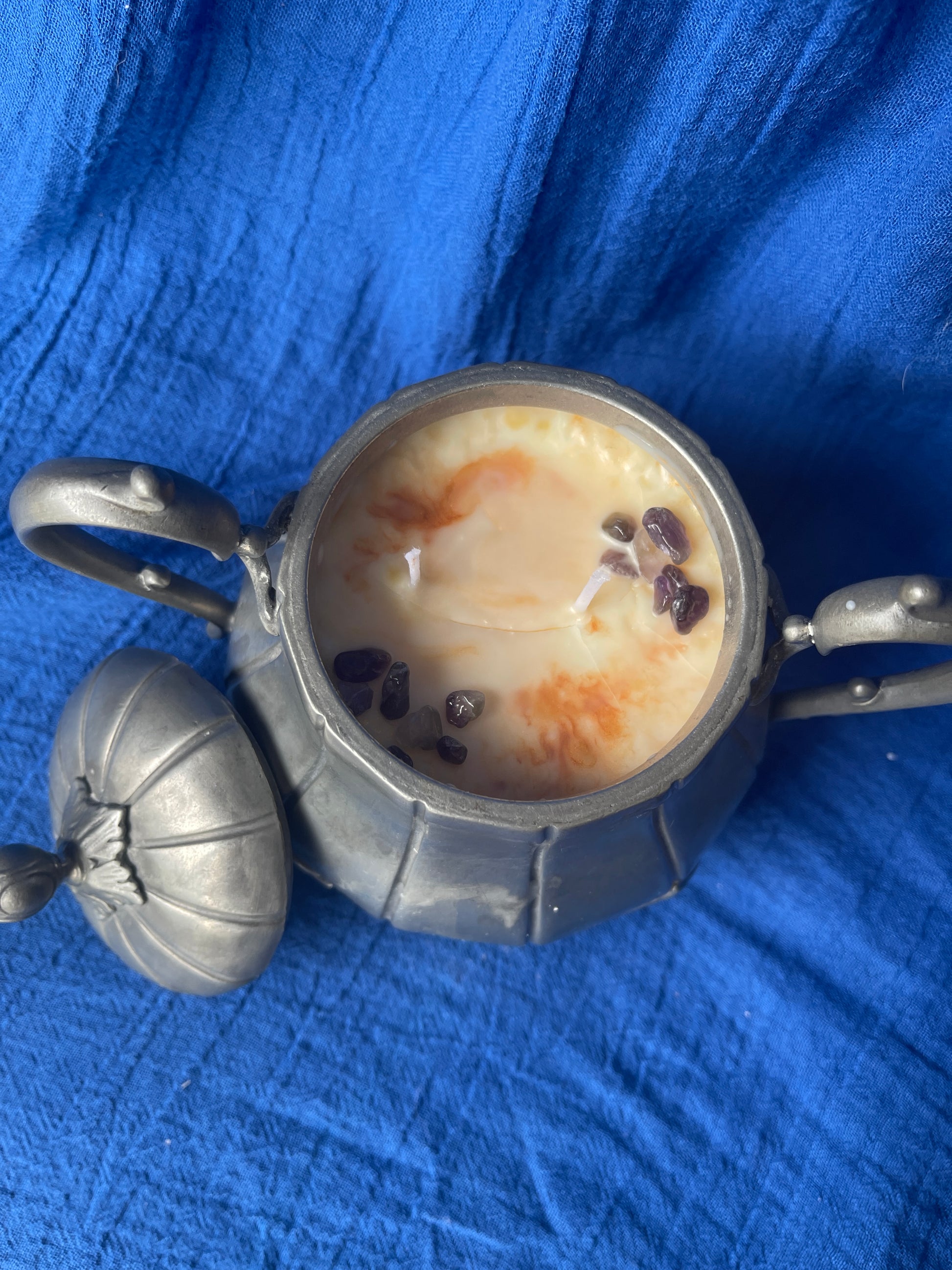 Sa flamme évoque le feu sacré qui crépite au cœur du chaudron, là où se mêlent intentions, émotions et renouveau. Elle est décorée de pierres d’améthyste, associées à l’apaisement, à l’intuition et à la sagesse spirituelle, à retirer impérativement avant l’allumage.